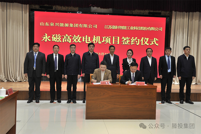 3月21日,山東泉興能源集團有限公司、江蘇嘉軒智能工業科技股份有限公司“永磁高效電機項目”簽約儀式舉行。棗莊市政協主席張兵,棗莊市委常委、常務副市長李守江,棗莊市委常委、滕州市委書記王廣部,江蘇嘉軒智能工業科技股份有限公司董事長付杰,山東泉興能源集團有限公司黨委書記、董事長張宗輝,以及我市領導劉