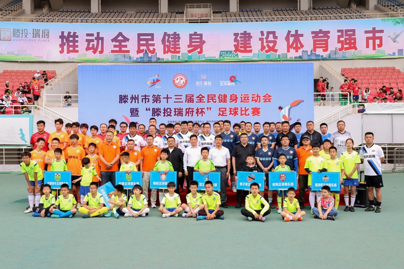 6月4日,滕州市第十三屆全民健身運動會暨“滕投·瑞府杯”足球比賽在市體育中心體育場隆重舉行。本次比賽由滕州市體育事業發展中心、滕州市體育總會主辦,滕州市足球運動協會承辦,山東滕建投資集團有限公司等單位協辦。滕州市體育事業發展中心黨組書記、主任丁濤,滕州市體育事業發展中心黨組成員、副主任、滕州市體育總會