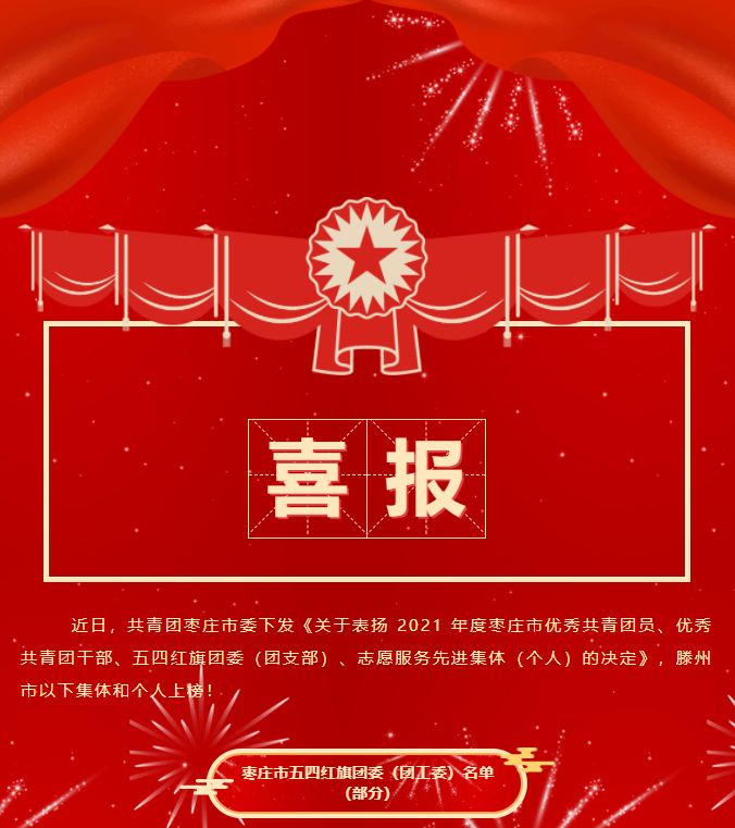 喜報 近日,共青團棗莊市委下發(fā)《關于表揚 2021 年度棗莊市優(yōu)秀共青團員、優(yōu)秀共青團干部、五四紅旗團委(團支部)、志愿服務先進集體(個人)的決定》,滕州市以下集體和個人上榜!棗莊市五四紅旗團委(團工委)名單(部分)棗莊市五四紅旗團支部(團總支)名單(部分)棗莊市優(yōu)秀共青團員名單(